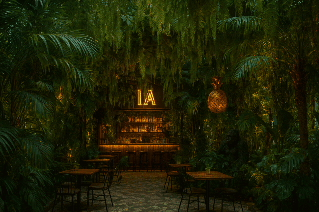 Μπαίνεις μέσα και νιώθεις ότι μόλις έκανες teleport στη ζούγκλα: φωτιστικά σε σχήμα ανανά, φυτά που κρέμονται από παντού, και ένα crowd που έχει επενδύσει περισσότερο σε self-tan παρά σε προσωπική εξέλιξη.