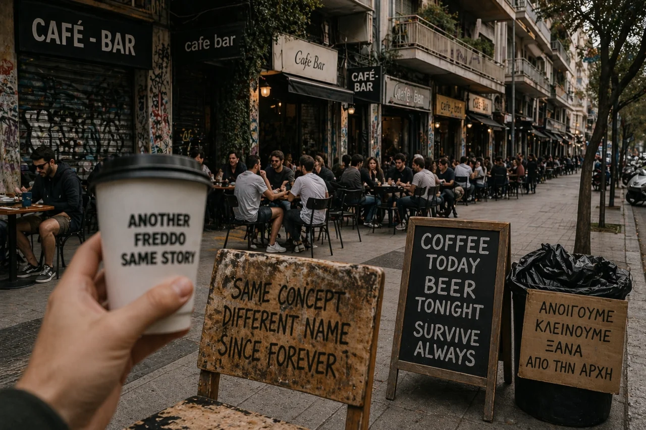 Η περιοχή μοιάζει να σφύζει από επιλογές. Περπατάς δύο τετράγωνα και μετράς καφέ, τραπεζάκια, κόσμο. Αν όμως σταθείς λίγο παραπάνω, θα καταλάβεις ότι αυτό που βλέπεις δεν είναι ποικιλία — είναι επανάληψη. Το ίδιο concept σε διαφορετική βιτρίνα. Το ίδιο μαγαζί με άλλη πινακίδα. Σαν να άνοιξε κάποιος ένα template και να το έκανε αντιγραφή μέχρι να γεμίσει ο χάρτης.